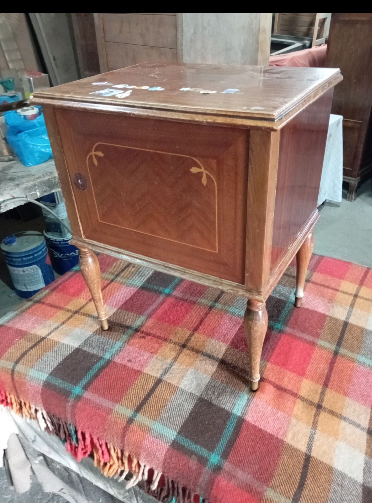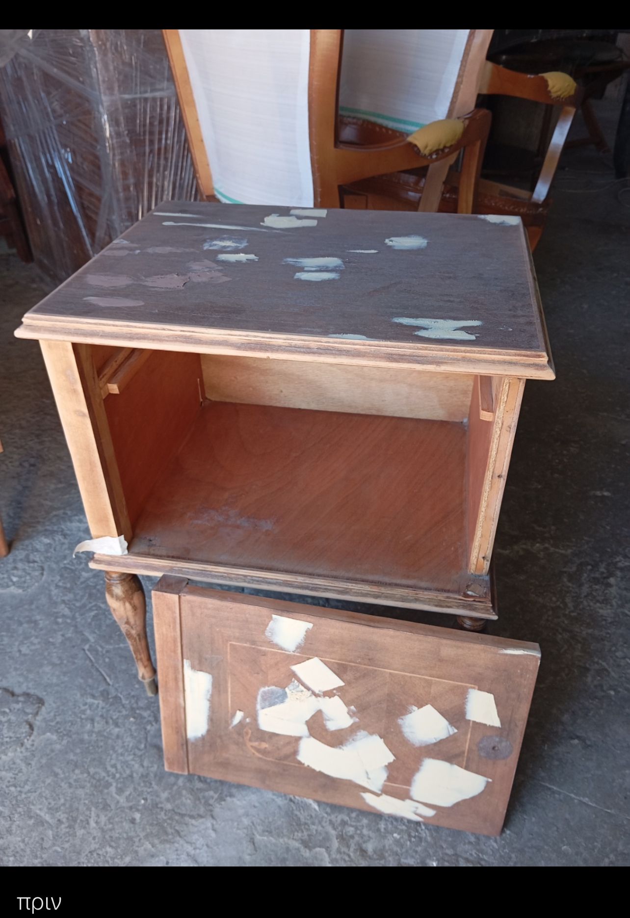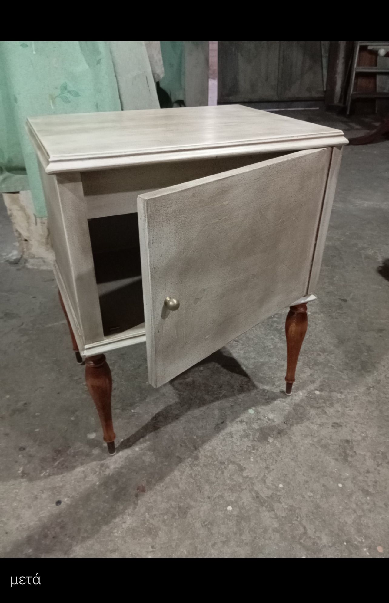 Aναπαλαίωση κομοδίνου σε πατίνα με διατήρηση των ποδιών στο φυσικό ξύλο καρυδιάς. Οι εργασίες που πραγματοποιήθηκαν ήταν γυάλισμα, πατίνα, ειδικό υγρό για το σαράκι αλλαγή μεντεσέδων.