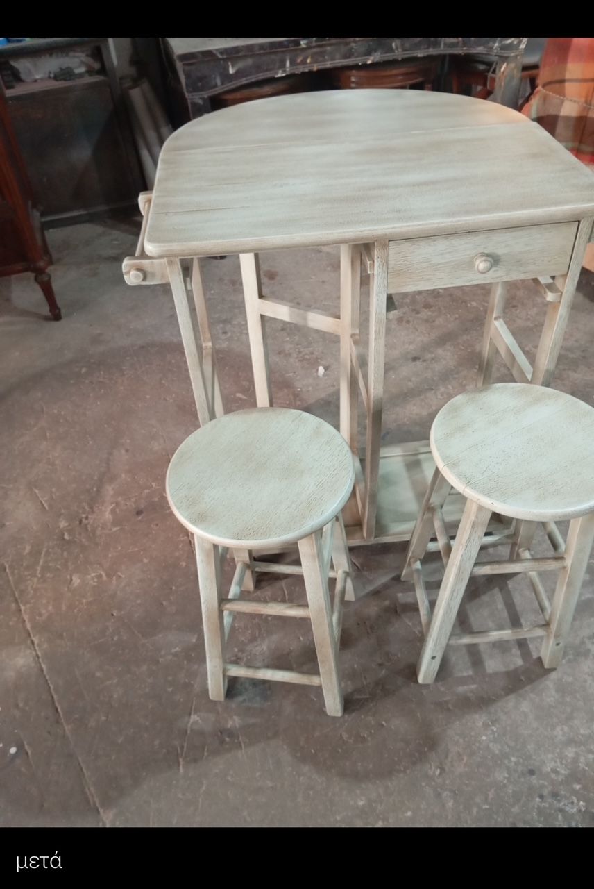 Μπαράκι τροχήλατο με σκαμπό. Παραλήφθηκε σε κομμάτια, μετατράπηκε σε πατινα σε εκρού αποχρώσεις αλλάχθηκαν τα ροδάκια, περάστηκε με ειδικό υγρό για το σαράκι, φτιάχτηκε καινούργιο συρτάρι.